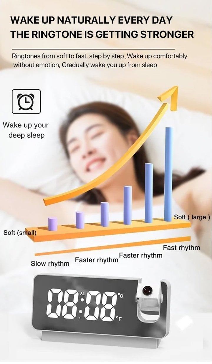 - 【180°Flip Projection 】The projection alarm clock clearly projects the time image on the wall or ceiling in the range of 9.84 feet, and the 2-level brightness of the image can be adjusted. Press and hold the Projection button to rotate the projected display 180° for optimal viewing. You can easily read the time while lying in bed.