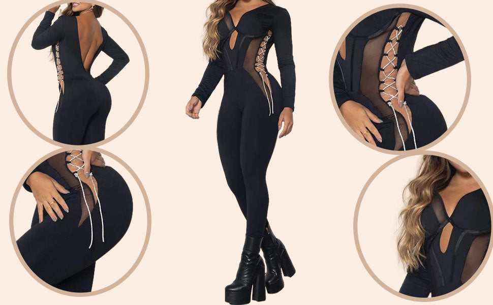 【OCCASION】This backless sheer mesh jumpsuit for women is suitable for cocktail, evening party, club, party, dating, celebration, ceremony, daily, shopping, holiday, etc.
