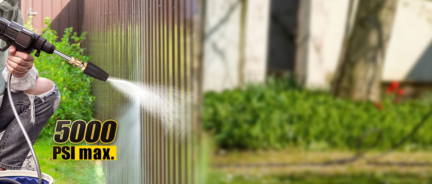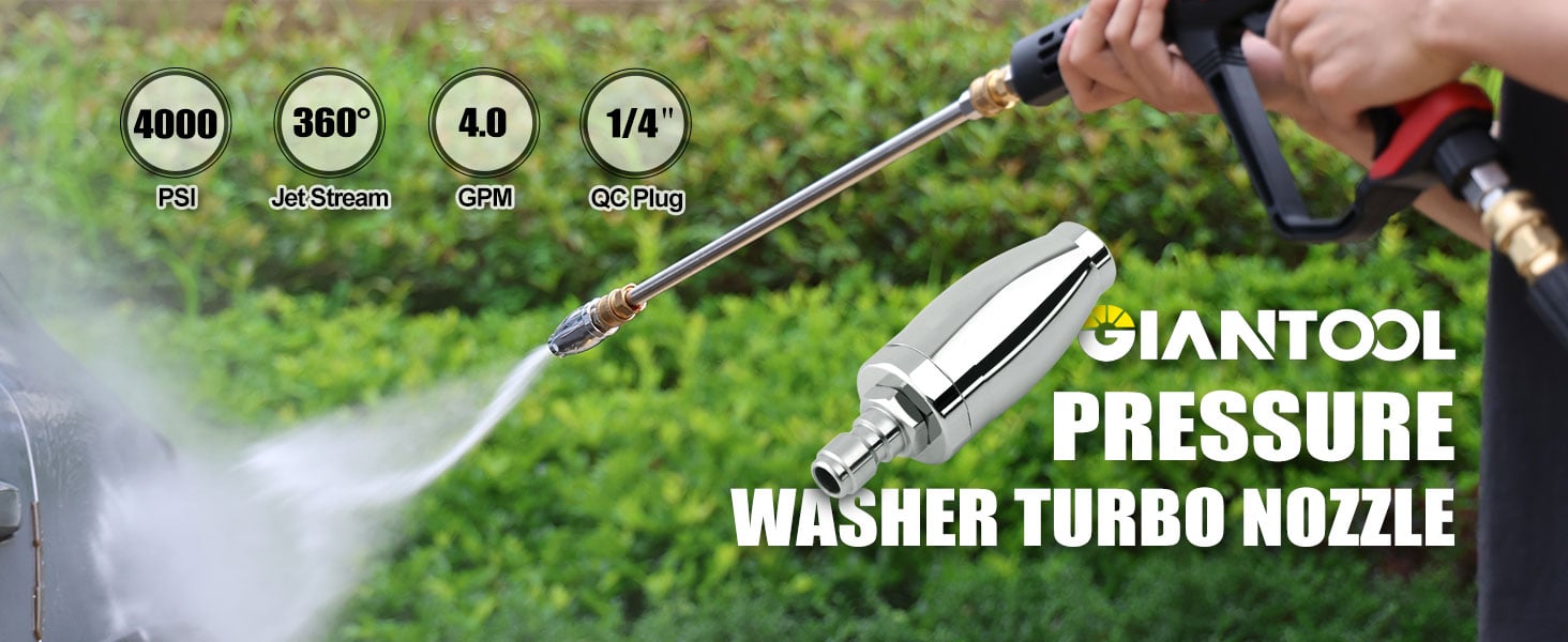 【Durable and Efficiency】Turbo nozzle pressure washer uses centrifugal force to produce a strong 3000PSI impact up to 4000PSI and 360 degree rotating spray pattern,the spray adds additional scrubbing ability to the cleaning process, the cleaning speed is more than 5 times that of a regular nozzle, making cleaning stubborn and large stains easy and quick.