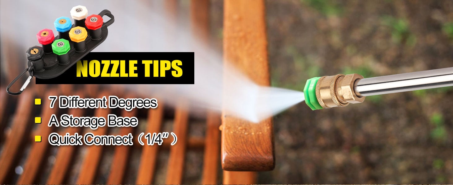 【7-Power Washer Nozzles Tips】We have 7 pressure washer accessories(nozzle tips) including different angle, red(0°), pink(soap), blue(rinse), orange(15°), green(25°), white(40°), black(65°). For cleaning high areas, hard surfaces, wood, fence, windows and etc.