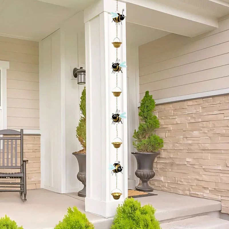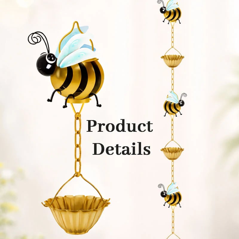 The chain is adorned with several handcrafted-style little bees, each with big eyes and dreamy blue wings, adding a touch of vibrant, childlike vitality to your eaves.